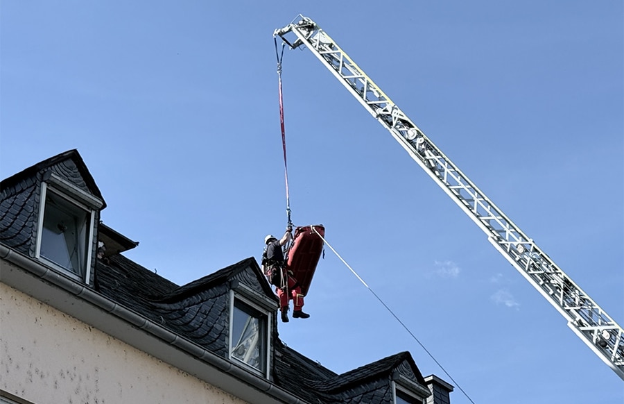 Grund für den Einsatz in der Hornstraße in Trier-West, ist die Unterstützung des Rettungsdienstes bei der Rettung eines Patienten aus einem Dachgeschossfenster.