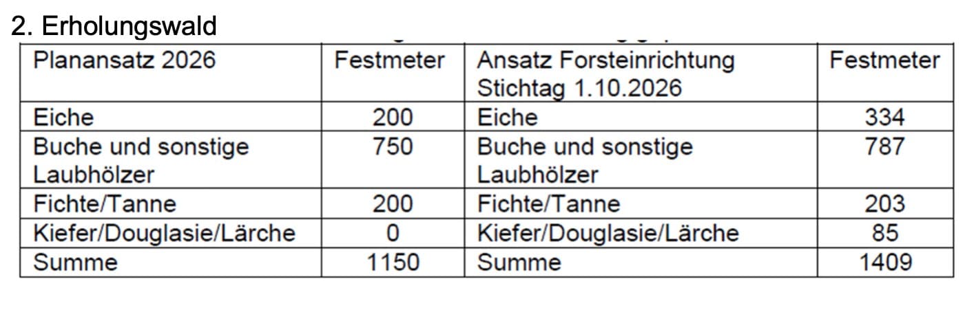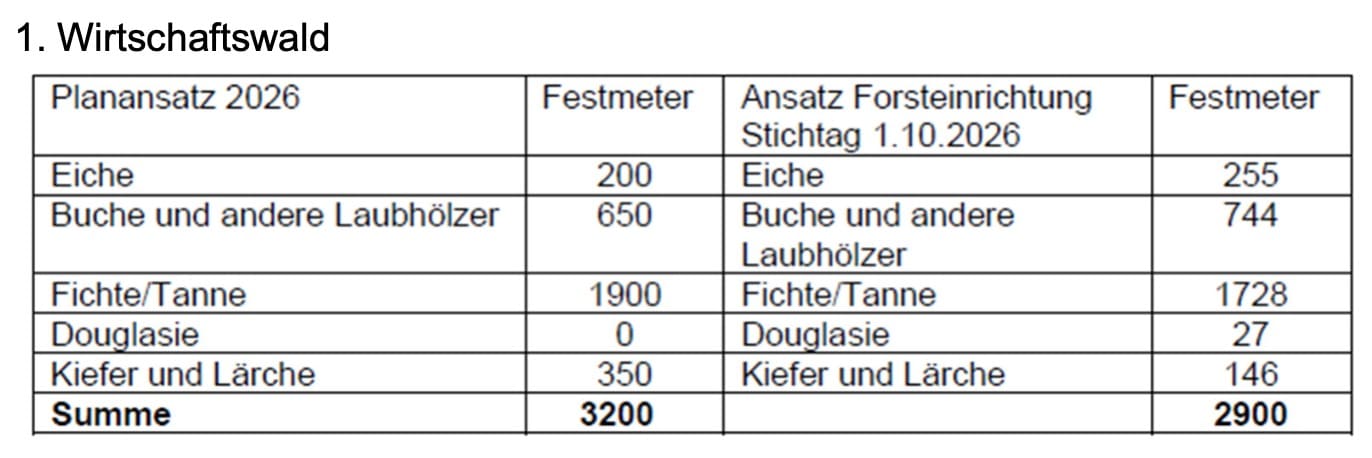 In den einzelnen Baumarten ist folgender Holzeinschlag geplant: