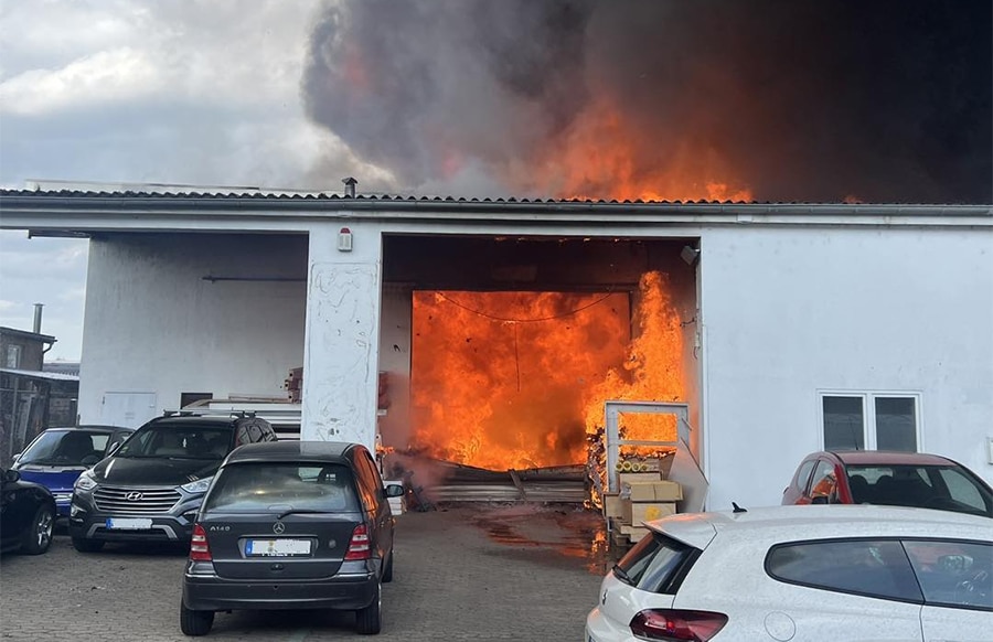 Als die Feuerwehr eintraf, stand die Halle bereits in Vollbrand. Der Schaden wird auf mehr als eine halbe Million Euro geschätzt. Ein Gutachter soll die genaue Entstehung des Feuers untersuchen.