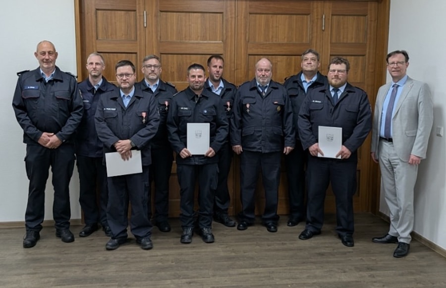 Ein weiterer Höhepunkt war die Verleihung des silbernen Feuerwehr-Ehrenzeichens am Bande für besondere Verdienste um das Feuerwehrwesen. Diese Auszeichnung erhielten David Backendorf, Eric Maaßen, Markus Thieltges und Gregor Zehe. Alle vier sind bereits seit 2011 als Kreisausbilder tätig. Ihr Schwerpunkt liegt insbesondere in der Grund- und Truppführer-Ausbildung. Darüber hinaus engagiert sich Eric Maaßen in der Maschinisten-Ausbildung, während Markus Thieltges auch in der Sprechfunker-Ausbildung aktiv ist.