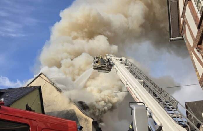 KRÖV. Aus bislang unbekannter Ursache ist in Kröv (Landkreis Bernkastel-Wittlich) ein leerstehendes Wohnhaus in Vollbrand geraten. Wie ein Sprecher der Feuerwehr Traben-Trarbach mitteilte, breitete sich das Feuer vom Dachstuhl bis in das Innere des Hauses aus. Verletzte gibt es nach Angaben einer Sprecherin der Polizei Bernkastel-Kues nicht.